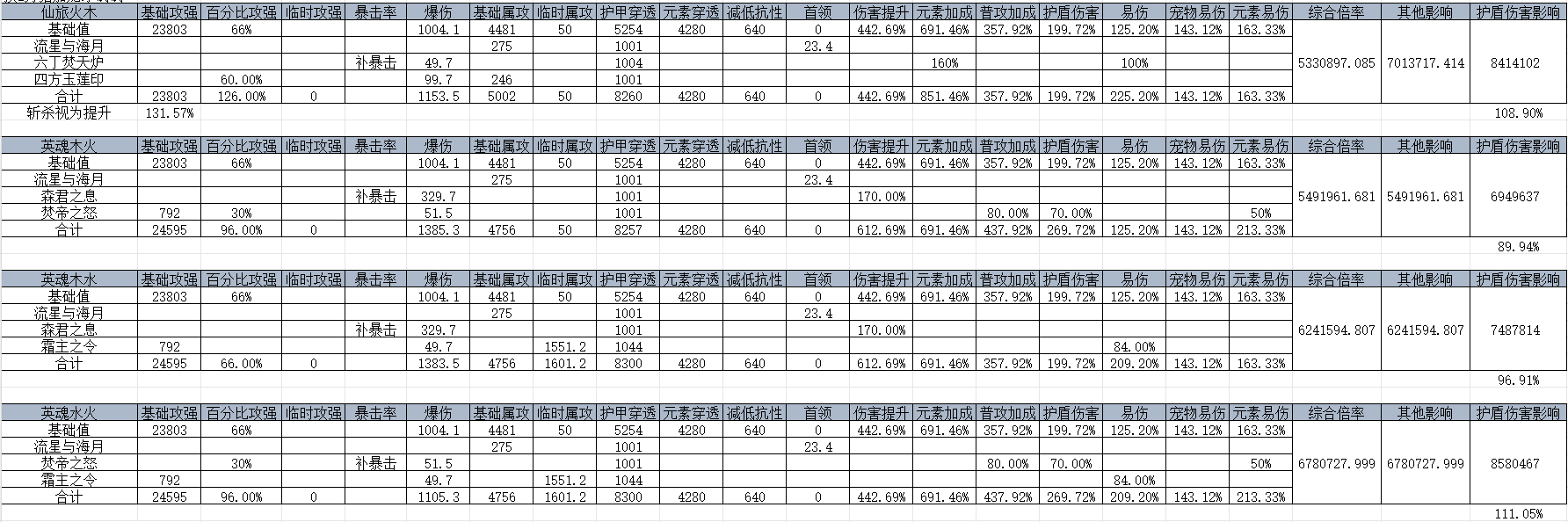 本次计算中,有个比较有趣的情况,如果是早3突袭+3贵族的比较通用的搭配的情况下,仙旅火木比之英魂水火强非常多,大概差距10%,也就一代武器的水平,但是如果是在使用3突袭+2狩猎+龙牙的情况下,那么英魂水火的伤害会略高于仙旅火木2%的伤害,并且还有聚怪的机制,