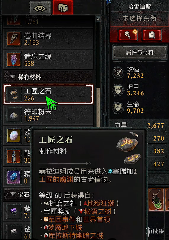玩家可以在《暗黑破坏神4》中的材料页面查看工匠之石的获取方法,可以在地狱狂潮区域余烬宝箱和谜语之树宝匣中概率获得,军团事件和世界首领会掉落,在梦魇地下城和幽暗之城也可以刷取。