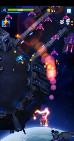 强调操作反馈与视觉冲击力的高速太空射击游戏。战斗节奏紧凑,支持多段位移、能量护盾充能及范围清屏技能——如冲击波爆发可一次性清除当前屏幕全部敌机。武器库包含激光炮、追踪飞弹、脉冲鱼雷等十余种实装载具,各具射速、弹道与充能机制差异。
