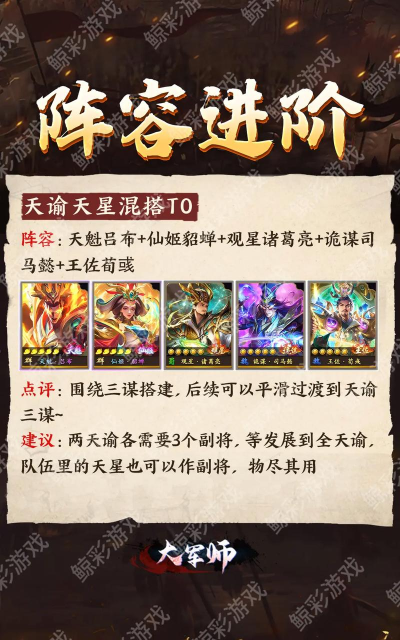 阵容搭配 加点: SP诸葛亮全智、黄忠全武、徐彦全智,速度比黄忠快; 以寡敌众的替代战法:刚勇无前、击其惰归; 深藏若虚、蓄势待发的替代战法:合军聚众、非攻制胜; 拜师: SP郭嘉、郭嘉、SP荀彧等智力、统率、速度高的武将; 历练: 侧重智力; 天赋: 选择蜀汉栋梁、危定济军、生生不息、身经百战、民心所望、敏而好学。
