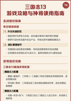 《三国志战略版》是一款热门SLG策略手游,攻略包括开荒技巧(碰瓷+侦查)、阵容搭配(如魏法骑、五谋臣)、武将培养(成长率分析)、资源管理(左民府、将作府)及玩法更新(同袍建筑增强、3V3竞速模式)等核心内容。