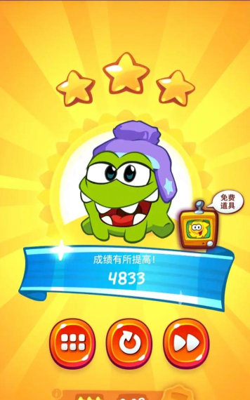 玩法介绍 游戏中,玩家要剪断绳子,让糖果可以将周围的星星击破又能进入Om Nom 嘴巴。 若糖果不知所终(即离开游戏屏幕范围),这关便不算完成。若糖果能进入怪物的嘴巴,这关便完成,同时下一关也将解锁。 在完成关卡后,玩家将根据获得一星到三星的评价,玩家可以任意多次重试,当然也可以重玩之前打过的关卡尝试获得更高的评价。