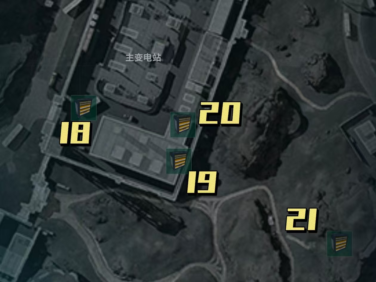 接下来就只剩下变电站区域的几个工具柜点位了,18号工具柜在变电站地图区域左下角的白色车头灰色车厢货车里面,不过这个需要骇爪的飞镖或者露娜的电击箭充电才能打开;我们进入主楼一楼之后,穿过一片配电箱之后来到地图右上角看到一张办公桌,旁边就有19号工具柜;转身向地图上方向看去,能看到一个被一面铁网围起来的配电箱,里面就有一个工具柜;在变电站和游客中心之间还有一个地下通道,进入方法很简单,出了变电站之后一直向着地图标注方向走,看到一颗非常突兀的大树之后再一直走,就能看到一片光秃秃的地面上有两块木板,进入地下通道之后推开面前铁门,21号工具柜就在里面了。