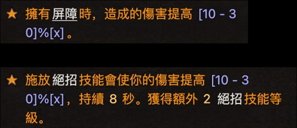 暗黑核的部分我就是放公版,各位只需要按照喜好并且依说明进行更动即可。这边提一下凯杖和资源消耗减免的机制,凯杖特效是当资源全满时,消耗全部资源,每消耗一点资源会提高伤害,但假设你有50%资源消耗减免,且总资源为200点,会变成是你只消耗了100点就等同200点的伤害,也就是说你实际是消耗了400点。但是资源消耗减免上限是75%,且使用乘法递减,所以在堆叠这条属性上要稍微注意。