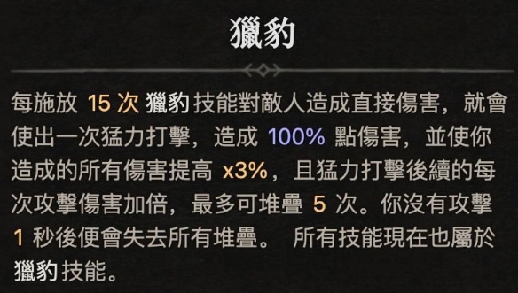 因为新版猎豹殿堂的额外攻击和最多5次的翻倍效果(指数成长)是需要施放”15次猎豹技能造成伤害后才能触发,也就是说在累积到最大伤害之前你的伤害就是刮痧,但是爪袭所对应的狂野爪击精华是视作额外施放,也就是说只需要施放8次爪袭就能够触发殿堂的额外攻击。此外为了能够快叠到最高伤害,会需要堆高攻击速度,也必须在装备上找爆击几率和几率挂易伤。