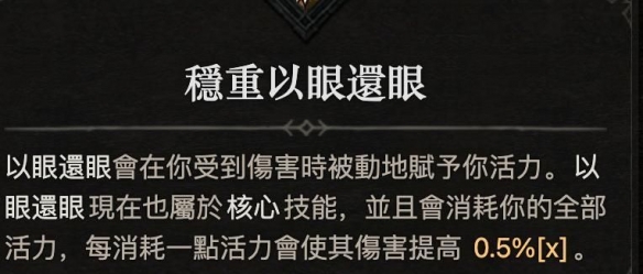 当我们进入苦痛一之后我们只要取得这两件暗金装备并且强化后,点出巅峰的传奇结点就可以轻松进入苦痛四。为什么可以那么轻松呢?因为飞鹰殿堂给的风豹之羽除了刚刚提到的淬炼等于乘法伤害之外还自带易伤效果,飞鹰殿堂是要0.5秒才会出毛,因此不吃装备的攻击速度,此外为了满足这组核心暗金的最大伤害加成,我们绝招会使用追迹者,当追迹者在场上时,必定爆击和易伤,这完美的组合让我们不需要特别去挑装备上的词缀,只需要着重在生存能力就可以。