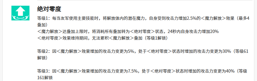 核心被动“绝对零度”并非独立施放技能,而是依赖队友协同触发的魔力解放系统。每当友方角色使用主力技能,勒内白银即可获得1层魔力解放(最高4层)。叠满后自动转化为“绝对零度”状态,持续24秒,提供20%全属性攻击力加成。该状态可持续通过战斗中重复触发魔力解放进行延长,但不可直接叠加持续时间;未达满层时,仅能通过角色等级提升基础加成比例。
