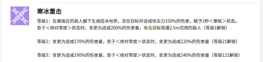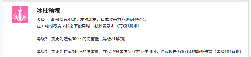 她的首个主动技能为“冰柱领域”,可在指定位置展开远程冰枪攻击,基础伤害为260%攻击力。当处于“绝对零度”状态下释放,不仅暴击率提升,且等级升至3后可解锁强化效果——该技能将额外附带寒气穿透,进一步扩大压制范围。