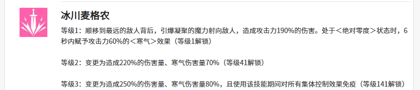 三技能“冰川麦格农”为单体超远距离打击技,锁定最远敌方单位进行魔力轰击,基础伤害190%。当角色处于“绝对零度”状态时,额外获得60%攻击力加成,总伤害达250%。此强化效果需角色达到141级方可完全激活,是后期关键爆发节点。