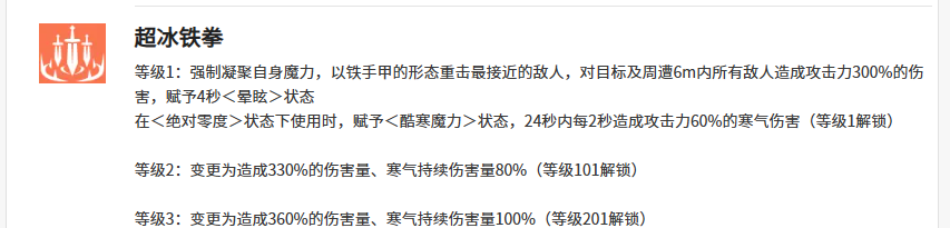 终极技“超冰铁拳”融合近战压制与范围控制:凝聚魔力后以重甲拳势轰击,对6米内所有敌人造成300%攻击力伤害,并附加4秒眩晕。若在“绝对零度”状态下释放,还将额外激活“酷寒魔力”效果——在24秒内每2秒对范围内敌人施加60%攻击力的寒气持续伤害。
