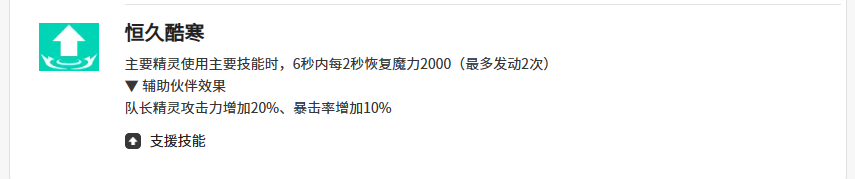 队长技“恒久酷寒”赋予团队续航与增益双重价值:开启后6秒内恢复2000点魔力值,且支持连续两次触发。当勒内白银担任队长时,全队成员获得20%攻击力提升与10%暴击率加成,显著强化队伍整体输出节奏与循环效率。