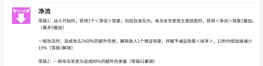 被动技能【净流】是整套体系的引擎:首次使用主动技能即可获得初始净流,每层提供60%额外伤害加成;叠加至5层时,总增伤达300%。每次驱散敌方1个增益,都将触发抹净减益——持续12秒,削减目标15%移动速度。减速效果不仅限制敌方走位,更为后续【波涛汹涌】创造稳定输出窗口。