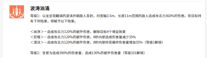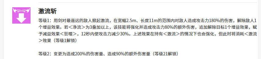 【激流斩】是一式大范围群体打击技,基础伤害为180%,并附带驱散效果。该技能仅在智河拥有至少3层净流时方可激活强化形态:额外提升80%伤害,并对命中目标施加狂噬减益——持续12秒,降低目标30%攻击力。同时,狂噬的强度亦随净流层数提升而增强,形成稳定的战力压制链。