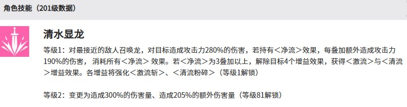 她的主动技能【清水显龙】可召唤水龙对目标造成280%基础伤害;若施放时自身已拥有净流效果,则额外触发190%增伤。更关键的是:当消耗全部净流层数且层数≥3时,该技能将强制驱散敌方4个增益状态,并为智河自身赋予1层净流与1层激流——这两个状态共同构成后续技能强化的基础。值得注意的是,若提前叠满5层净流再释放此技,所返还的净流将持续强化后续输出节奏。