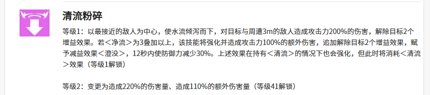 【清流粉碎】兼具位移与战术干扰功能:突进至目标位置造成200%伤害,并驱散2个增益;若在命中后追加一次判定(如连招或特定时机触发),可再次驱散2个增益,并施加沉默