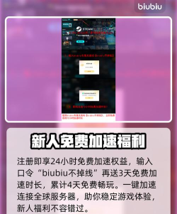注册账号吧,给新人可是会送24h用,再来领取一个暗号码吧,用【biubiu不掉线】又多拿72h的服务时间,综合起来这些福利是有96h给到新人的。还有限时活动在,12月18日到1月18日期间,steam冬促购买的游戏能来查找下限免加速服务,尽情在限免加速库中翻阅吧,Steam平台也享受该服务的。