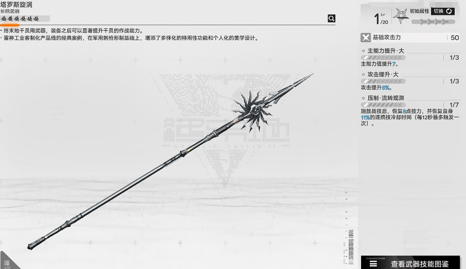 第四位是【塔洛斯漩涡】:长柄类武器,基础攻击+7%,攻击速度+6%。其核心技能“压制流转观测”在干员静止状态下,每8点精力恢复可缩短11%连接器类技能冷却时间;该效果每12秒至多触发一次。虽冷却较长,但具备稀缺的冷却压缩能力,适用于依赖连接器协同作战的六星辅助或支援型干员。