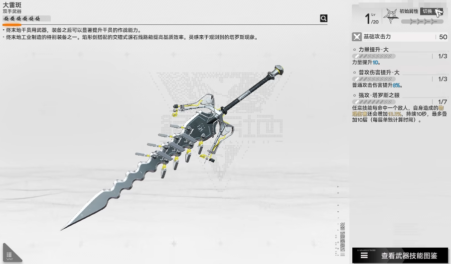 次选【大雷斑】:同属双手武器,提供90%力量加成,并赋予普攻69%的强攻增幅。其被动技能“塔罗斯之言”可在每次普攻命中时,基于本次物理伤害额外附加60%伤害,该效果可持续10秒,最多叠加10层;各层独立计时,不共享持续时间,适合高频攻击型六星干员,如爆发系近卫或特种。