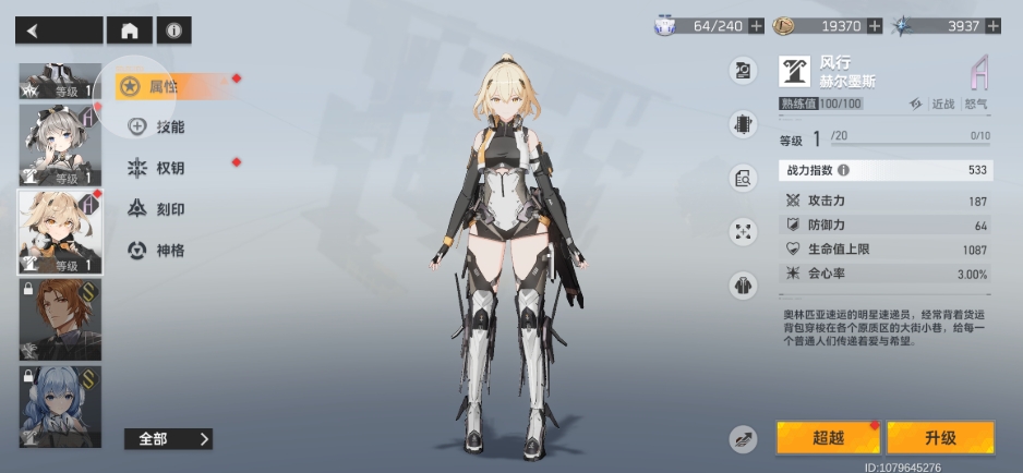 风行赫尔墨斯是一个风属性初始A级角色,强度并不是很高,她的普攻分为四段,全部命中敌人能获得三十四点怒气,需耗时三秒钟的时间,被动是自身开始移动后的五秒内持续加速直到进入矢量加速状态,该状态下能开启二技能的追加攻击。风行的一技能是快速进行两段踢击,第二段攻击命中时会为敌人附加持续十秒钟的逐风标记,同时目标脚下会出现一个弱点方位,从弱点方位内攻击目标时能提升百分之二十多的伤害。