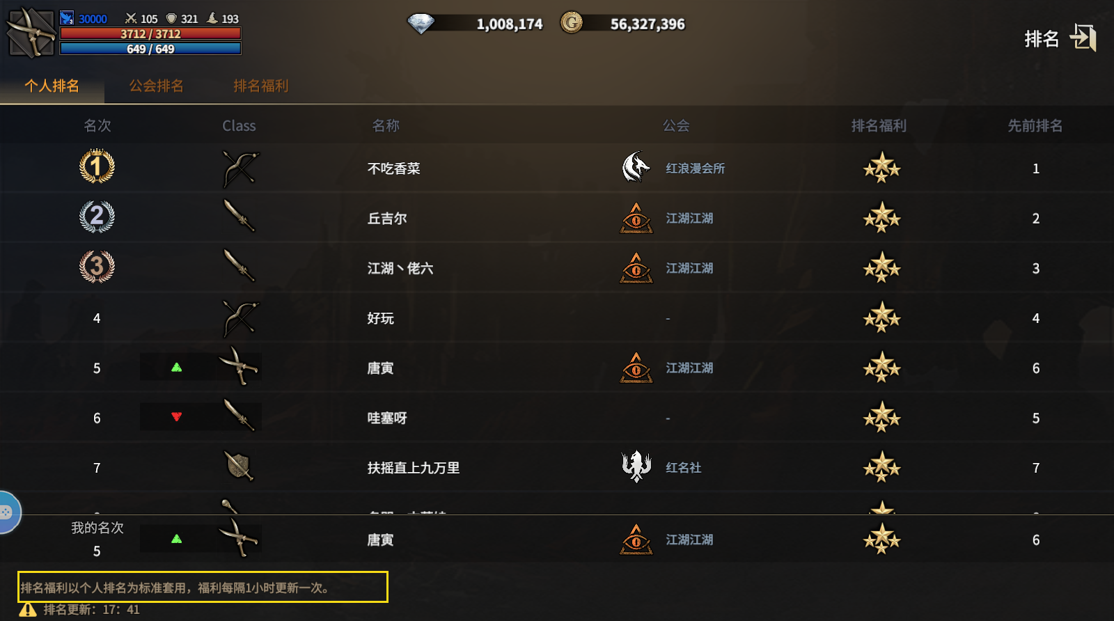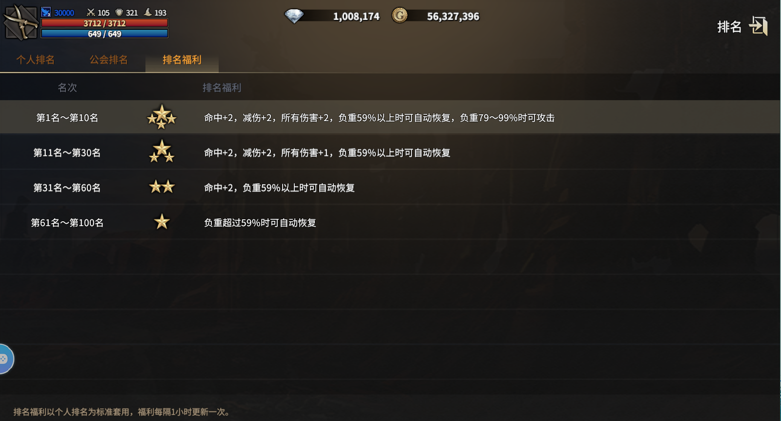 在各项个排名中,排名前100的角色可以获得各种不同的BUFF奖励。