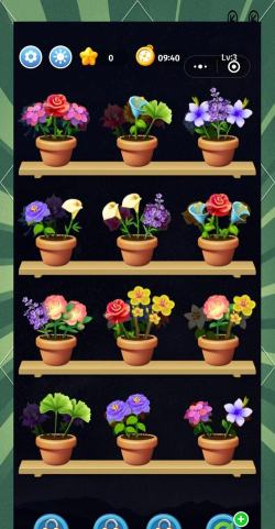 满屏的盆栽花朵,每一朵都带着不一样的色彩,刚进关卡就能被这一片颜色晃到眼,玩法比较简单。只需要在不同的花盆里凑齐三朵一模一样的花,就可以把它们消灭掉,这一关里足足有几十种不同模样的花,每一种都有自己的小特色。我们要把屏幕上所有的花全部消干净,才算真正的闯过这一关,整个游戏的画风特别有趣,主背景是一间粉嫩嫩的小屋,搭配着各色花朵的点缀,看着就很舒服。