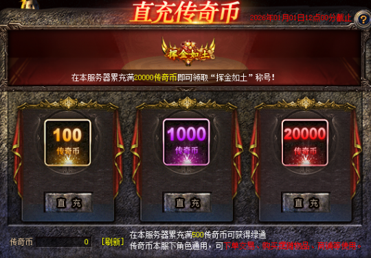 【活动一:新服“预充值”尊享绿通服务】预充值时间:12月24日中午12:00起至2026年1月1日中午12:00(活动限时!)参与区服:三区 流星[散人专区]友情提示:参加活动前,需要将客户端更新至最新版本。更新步骤:请先关闭客户端及登录器,再重开登录器,将游戏更新至最新版本。只有最新版本才能显示正确的绿通活动参与条件(即本服预充值满500传奇币);如未更新,可能出现异常显示。