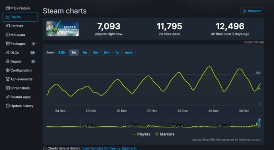 SteamDB显示,《阿凡达:潘多拉边境》Steam同时在线峰值为12496人,为两天前达成。在此之前,该数据只有2614人。