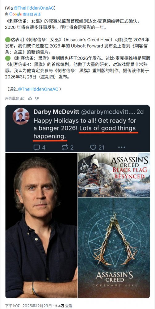 Darby McDevitt最近确认2026年将有很多好事发生,明年将会是精彩的一年”,暗示《刺客信条:女巫》以及《刺客信条4:黑旗-重制版》都会在2026年发售