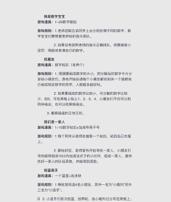 1.逛三园 游戏规则:由20人组成,口号分别是:星期一,逛三园,什么园,(蔬菜)(水果)(动物)园.排头的人先喊星期一,其余的人依次喊,确定什么主题园之后,依次快速说本次主题的相关内容,说出的内容若与主题不符就要接受惩罚. 2.抢数 游戏规则:由20人组成,先确认在场每一个人选一个男(女)明星的名字代表自己,全部确认一遍后游戏开始将不能再重复告诉别人你叫什么,有主持人喊1,其余人要迅速报接下来的数...