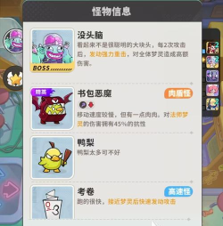 第15关里的boss敌人为没头脑,可会在自身进行两次攻击后,对全体梦灵成高额伤害,所以一旦令它靠近防线频繁进行攻击,队伍的生存压力会很大,也令人们在挑战该关卡时,很需要在队伍里带上一个可加血的梦灵,亦或是有击退能力的梦灵。而本关卡里的精英怪为书包恶魔,它会在中间轮次出现并缓慢地朝防线靠近,自身的肉度很不错,且自带对法师梦灵的抗性增加,也使得法师梦灵不太适合在本关中上阵,所以人们在组建配队时,最好将法师类梦灵剔除。