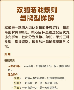 双扣游戏牌型多样,出牌需遵循规则,如炸弹可用来炸牌,配合队友出牌是关键。游戏强调团队协作,避免藏牌影响整体策略。