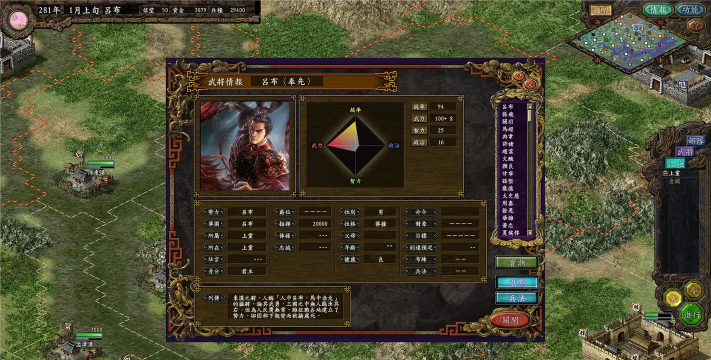 《三国志9》是一款策略战棋游戏,采用单一大地图模式,结合即时战略与回合制玩法。玩家通过战略面下达指令,进行面观察执行结果,每旬消耗时间,一年共36次活动。操作需结合地形、行军规则,合理运用武将与战术。