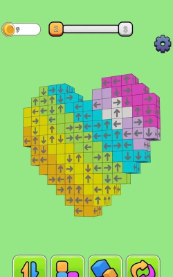 以3d的风格所打造,可以对箭头进行消除,在玩的时候可以通过锻炼脑筋的方式来完成闯关的任务,尽量的要使用最短的时间。在每次闯关的过程当中,除了显示的立体方块在颜色上不一样,所显示的箭头设计也是有一些区别的。你需要在规则一样的游戏世界当中,通过点击移动所有方块,合理的规划,来完成消除任务。