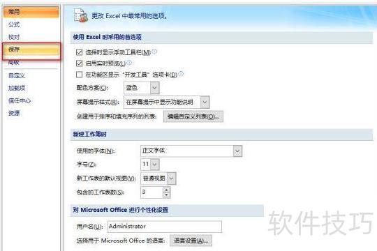 在Excel选项窗口中,选择保存,将保存自动恢复信息时间间隔由10分钟改为1分钟。