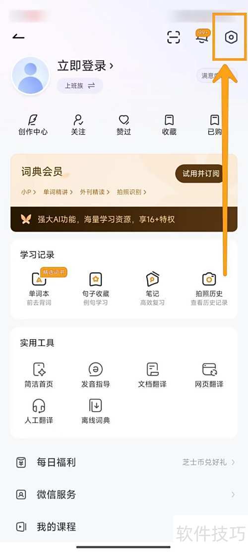 4、 打开网易有道词典,点击首页左上角的我的进入个人页面。