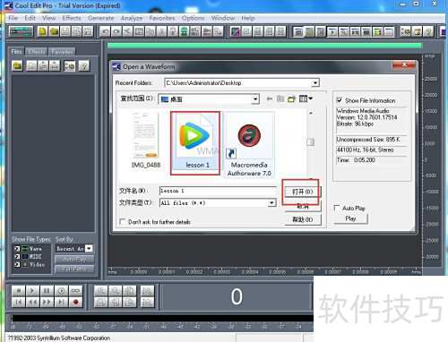 2、 按Ctrl+O,选择所需音频文件后点击打开。