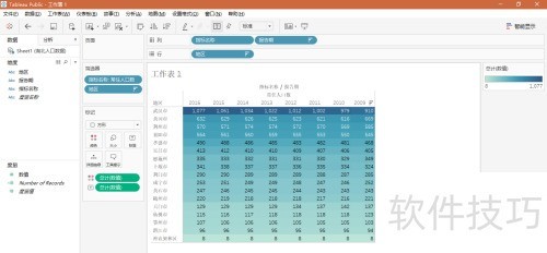 4、 我们采用了2009至2016年湖北省各市常住人口数据,为直观展示人口分布情况,选取四个关键字段,通过突出显示的表格形式进行可视化呈现。