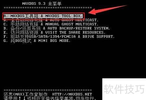 3、 在MAXDOS主菜单中,选择A.MAXDOS工具箱并按回车键确认,操作界面所示。