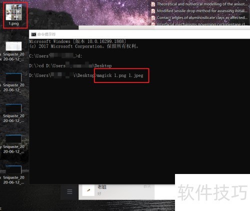 5、 接下来演示如何使用ImageMagick对图片进行格式转换。只需输入命令:magick 1.png 1.jpeg,即可将桌面上的1.png文件转换为1.jpeg格式,操作简单快捷,适用于批量处理不同格式的图像文件。