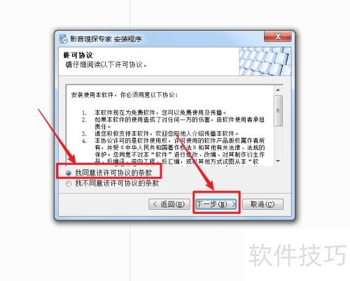 2、 在弹出窗口中勾选同意协议条款,然后点击下一步继续操作。
