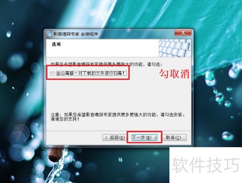 5、 取消金山毒霸对下载文件扫描的选项,然后点击下一步继续操作。
