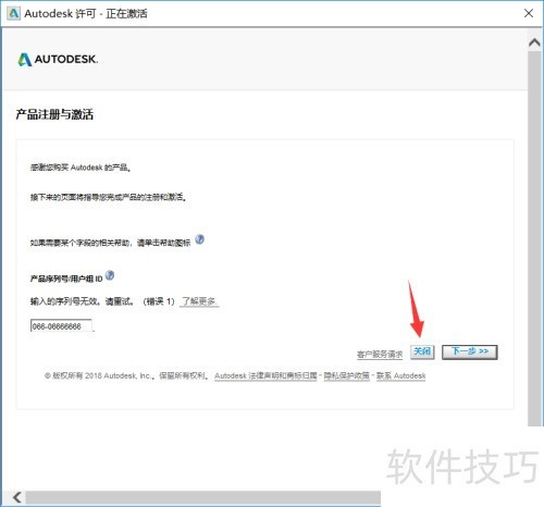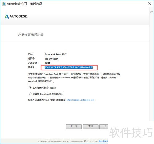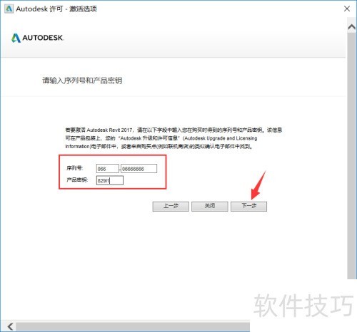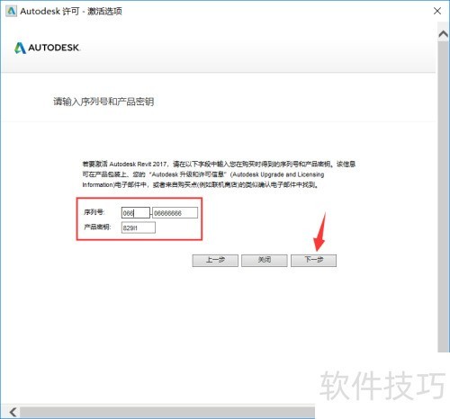 24、 请输入由 Autodesk 提供的激活码,将复制的激活码粘贴至输入框,然后点击下一步继续操作。