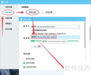 5、 进入YY主界面,点击右下角设置,依次选择语音视频和音频设置,将麦克风设备设为Screaming Bee Audio,最后确认保存即可完成配置。
