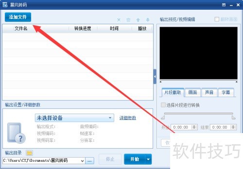1、 启动电脑中的暴风转码程序,随后点击界面中箭头指示的添加文件按钮。
