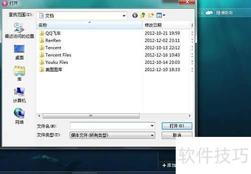 3、 添加本地歌曲时,点击选择文件,弹出窗口后进入音乐存储路径,选中所需歌曲(可按住Ctrl键多选),确认打开,所选歌曲便会显示在播放队列中,方便随时播放。