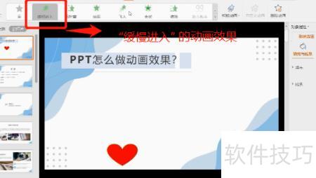 单击动画后,将显示如缓慢进入等不同动画效果选项。