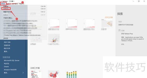 1、 启动Tableau软件后,点击右上角文件菜单中的打开选项。