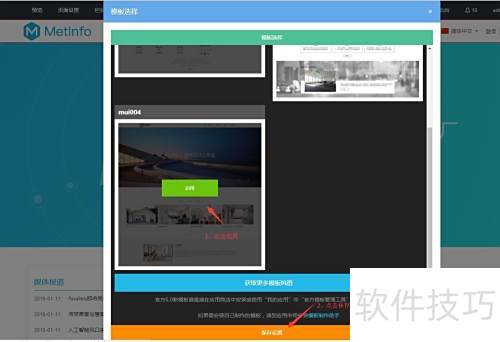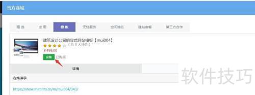 2、 安装 MetInfo 后,登录后台进入可视化编辑界面,依次点击增值服务、官方商城、模板,搜索对应编号并安装,需使用已购买模板的会员账号登录方可操作。