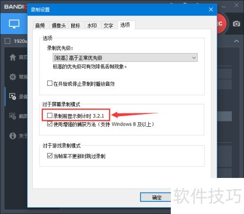 4、 在录像设置界面的选项页面中,找到屏幕录制模式下的录制前显示倒计时3.2.1选项,勾选其前方框即可启用倒计时功能,具体操作所示。
