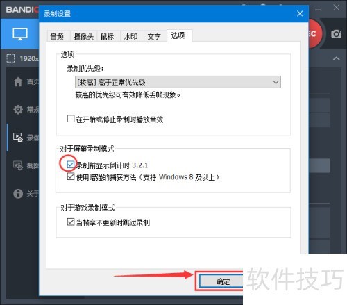 5、 勾选录制前显示倒计时3.2.1后,点击右下角的确定按钮,具体操作见下图。